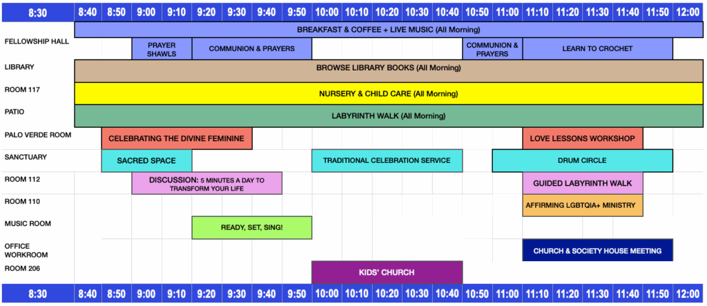 You’ll find a light continental breakfast, drinks and coffee in the Fellowship Hall. Eat inside or at tables on the courtyard. Donations are appreciated to help continue this ministry.
