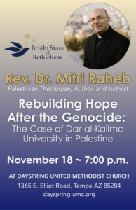 We are sincerely honored to host Mitri Raheb at Dayspring. He was born and raised in Palestine and recognized as the most widely published Palestinian theologian, author, and editor of over forty books. With his profound understanding of theology and social issues, Rev. Dr. Mitri Raheb continues to inspire and engage audiences worldwide. Please mark your calendar and share with others. Learn more at brightstarsofbethlehem.org